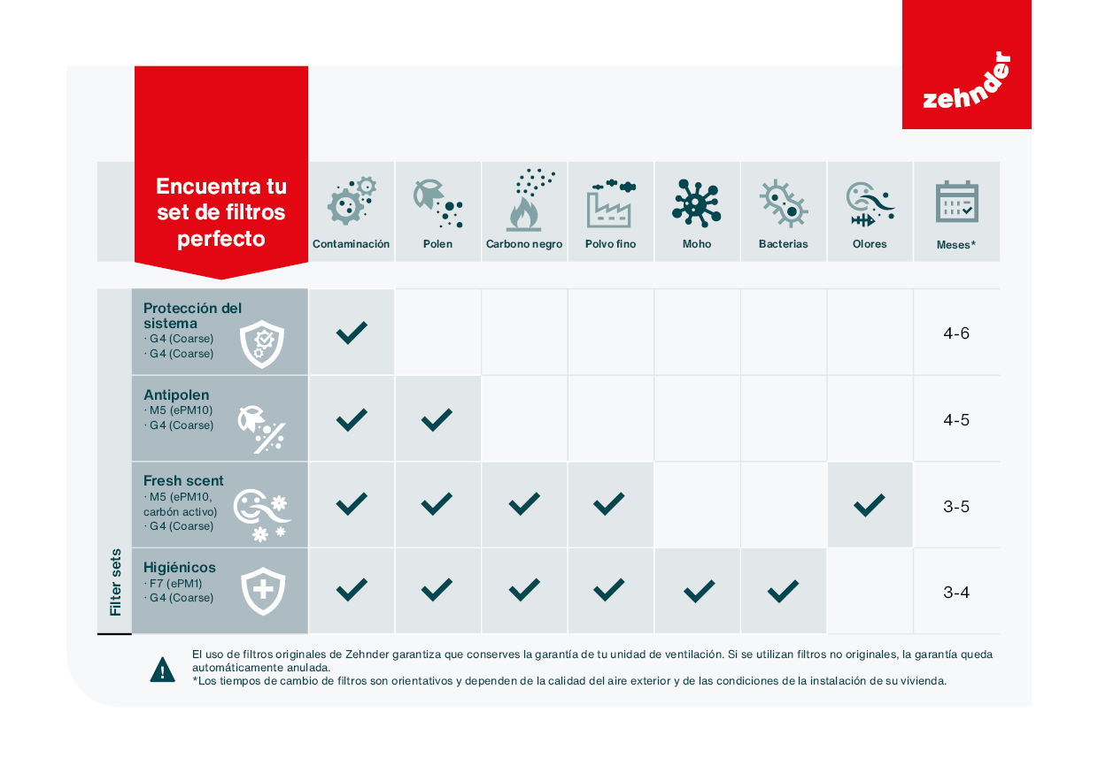 Los filtros diseñados por expertos de Zehnder proporcionan un rendimiento óptimo y se adaptan a diferentes necesidades, tanto si necesita protección contra el polvo fino, el polen o los olores. Con sustituciones periódicas y el sistema de filtración adecuado, podrá disfrutar de una mejor calidad del aire interior, un menor consumo de energía y un bienestar a largo plazo.