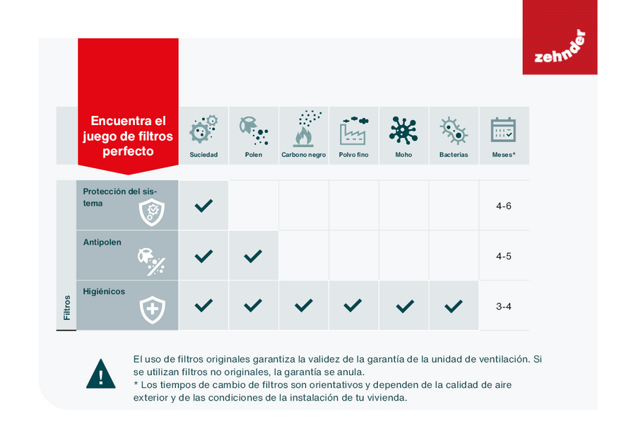 Elegir filtros originales Zehnder significa también cuidar tu sistema de ventilación: ayudan a prolongar su vida útil, reducen la necesidad de mantenimiento y garantizan un funcionamiento óptimo durante mucho más tiempo.